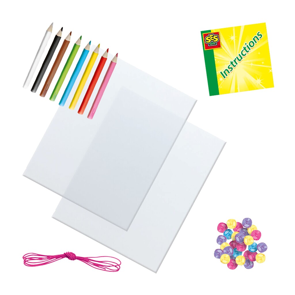 Met deze magische krimpfolie kunnen kinderen supermooie, eigen ontworpen bedels maken! Met deze set van SES Creative kunnen kinderen zelf aan de hand van voorbeelden eigen ontwerpen maken van krimpfolie. In de oven krimpt de folie en zo worden eigen bedels gemaakt die aan de armbanden gemaakt kunnen worden. Met alle kralen, het roze koord en de verschillende potloden zijn unieke sieraden te maken!