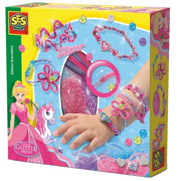 Artnr. SES 14128. Met glitter draden van gaas en chenille ontwerp je kleurrijke armbanden. Mix en match de verschillende kleuren en kralen.