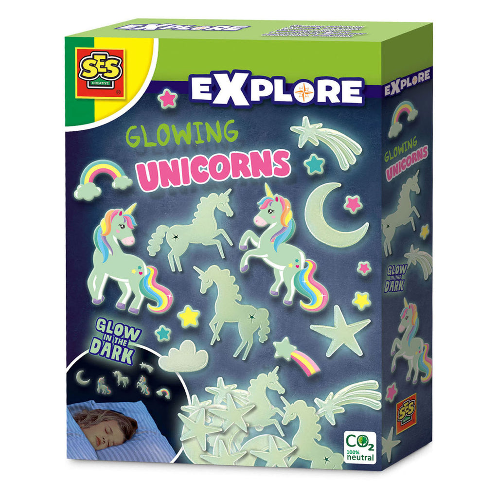 Met deze Glowing unicorns word jouw slaapkamer magisch als het donker wordt! Plak de stickers op de Glowing unicorns en maak jouw eigen fantasie, zo op je muur of plafond. Als het donker wordt lichten ze één voor één prachtig op. Deze set bestaat uit 4 kunststof unicorn vormen met dubbelzijdige foam plakkers waarmee je ze kunt bevestigen. Daarbij krijg je 20 glow in the dark sterren, manen en wolken stickers. Geef een extra dimensie aan jouw Eenhoorns door ze naar jouw smaak te beplakken!