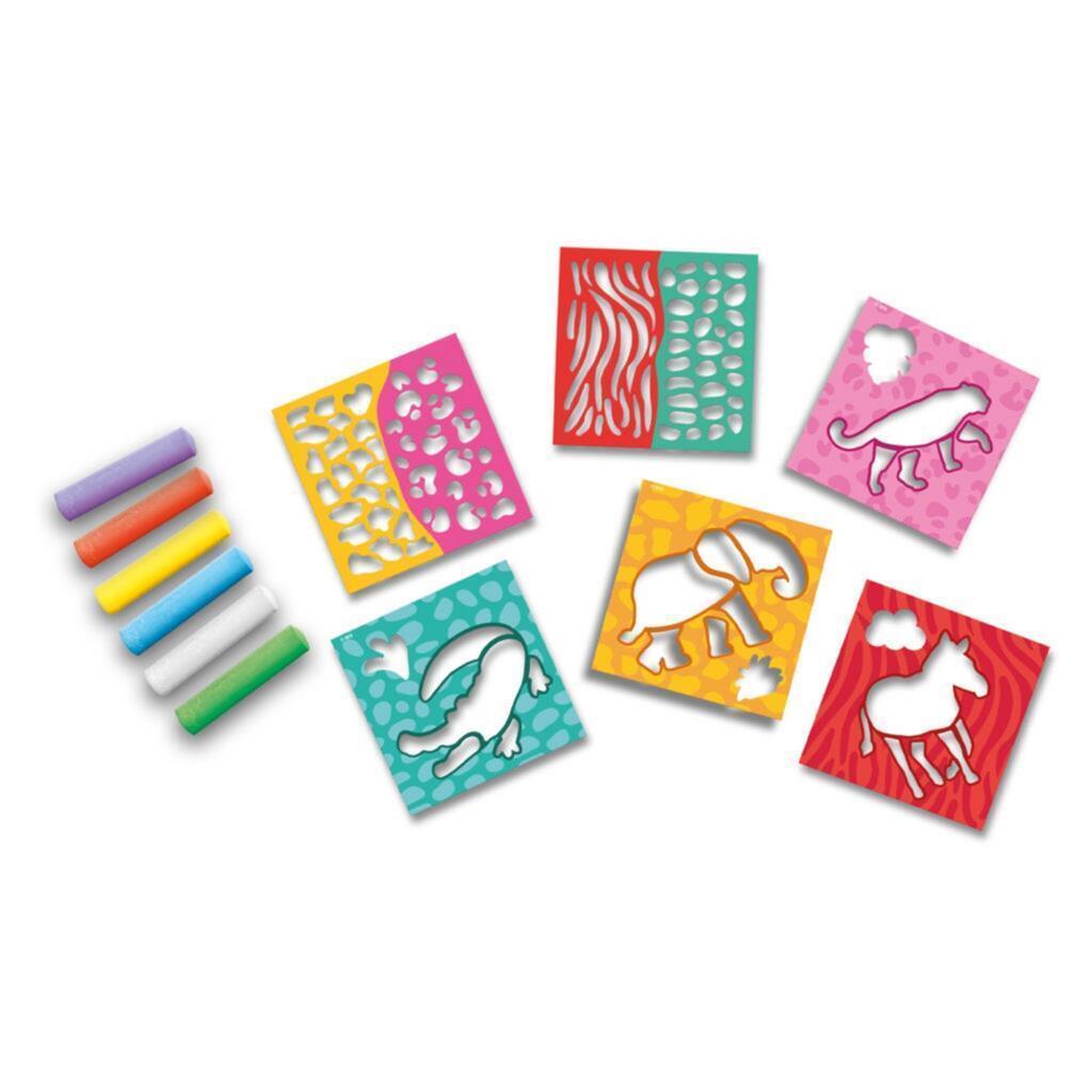 Deze set bestaat uit 2 kunststof dierenprint sjablonen, met 4 dierenpatronen. Daarbij horen de 4 kunststof dieren sjablonen en 6 kleuren stoepkrijt.