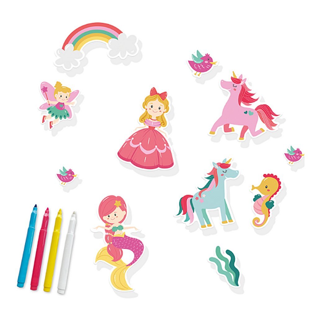 Maak je eigen sprookje op het raam. In jouw verhaal is alles mogelijk met de vele raamstickers. Gebruik de 4 kleuren glasmarkers om tekeningen, tekstballonnen en meer toe te voegen. Je kunt een prinses laten praten met eeneenhoorn of een zeemeermin naar de regenboog laten vliegen. Het is aan jou!