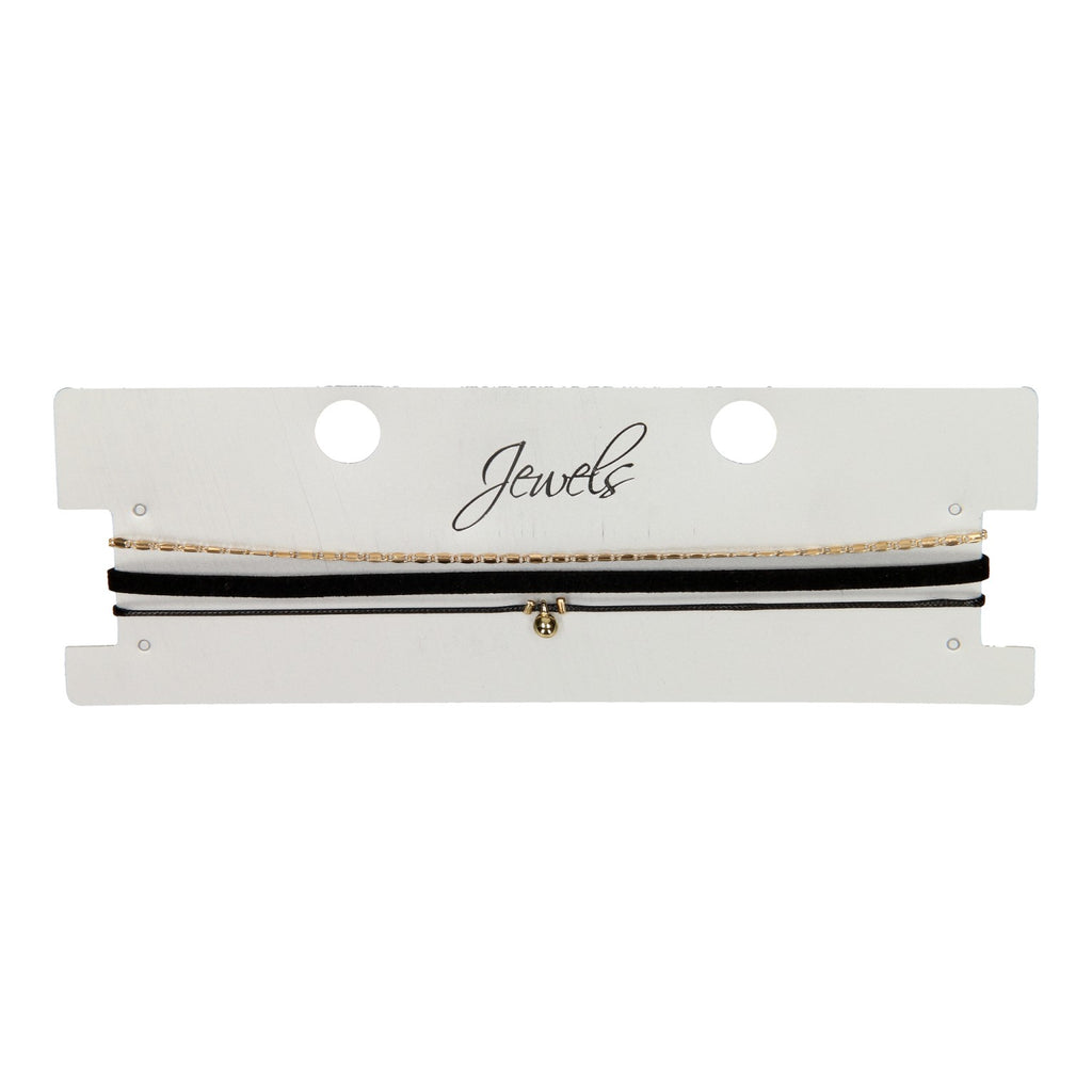 Set met drie chokers: een goudkleurige choker, een dunne zwarte choker met gouden bedeltje en een iets bredere zwarte choker. De chokers hebben een in maat verstelbare sluiting.