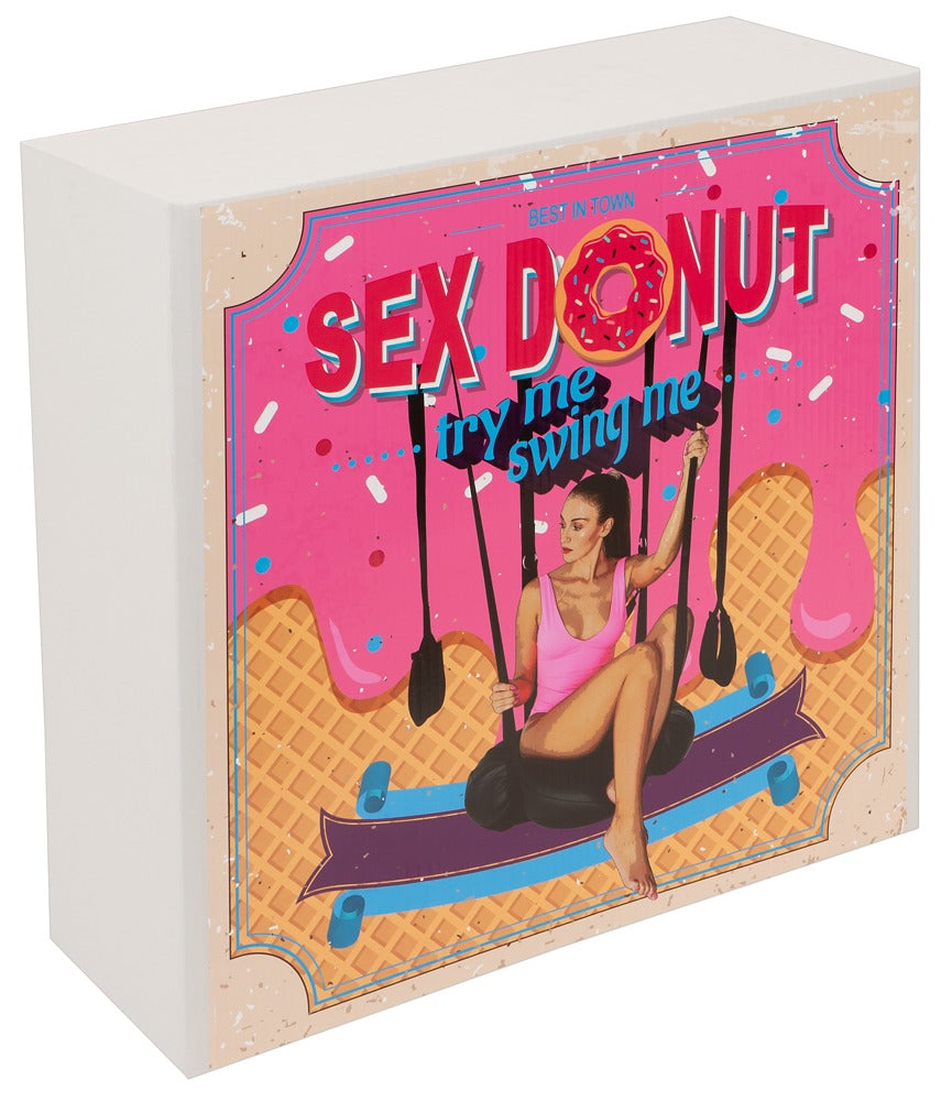 The Sex Donut sex swing allows for imaginative and versatile positions without having to contort oneself. The thick, soft, round seat cushion and the wide, padded back strap ensure maximum comfort and convenience. The central seat (cushion) can also be removed from the donut (ring) to enjoy more sex variations through the opening. The padded foot/leg loops are also adjustable in height for comfortable positions with wide spread legs.