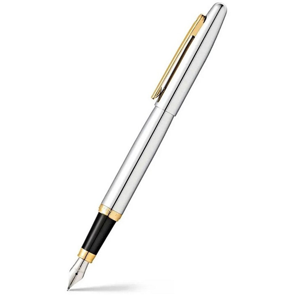DeSheaffer SF-E0942253 vulpen VFM in glanzend chroom met goudkleurig gepolijste afwerking is voorzien van een medium penpunt M van roestvrij staal dat een nauwkeurig en betrouwbaar schrijfcomfort garandeert. Inclusief een universeel standaard Sheaffer inktpatroon in zwart. De populaire Sheaffer vulpen VFM maakt indruk met zijn moderne, taps toelopende silhouet en is een combinatie van moderne elegantie en de hoogste kwaliteit. De wereldwijd erkende witte Sheaffer stip, die symbool staat voor schrijfexcellentie, kwaliteit en prestige, is terug te vinden op de clip. De Sheaffer VFM pennen zijn beschikbaar als vulpen, rollerball en balpen in een breed scala van eigentijdse kleuren en worden geleverd in mooie geschenkdoos.