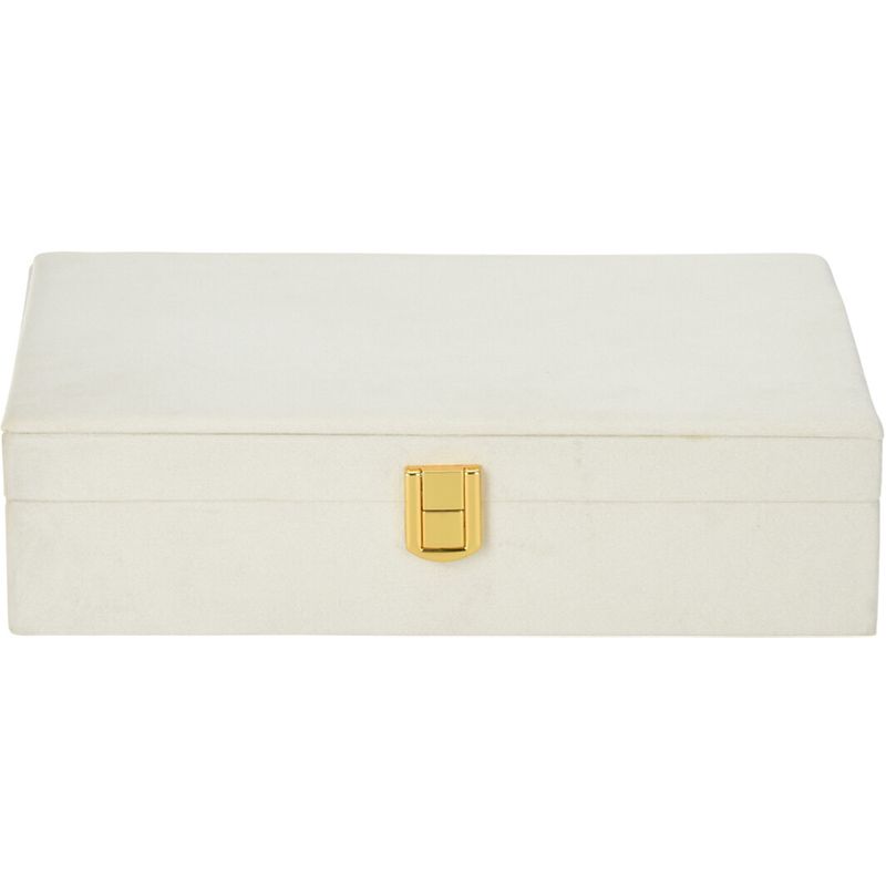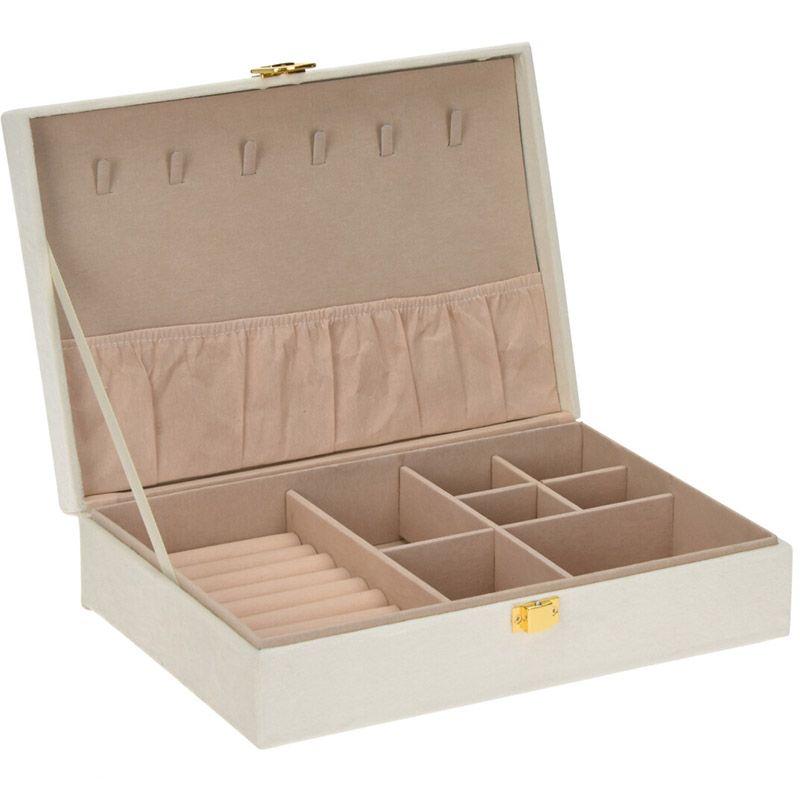 Met deze luxe juwelenbox houd je al je sieraden netjes en geordend bij elkaar. De opbergdoos heeft 8 compartimenten waardoor je armbanden, oorbellen, kettingen en andere accessoires praktisch op te bergen zijn. 1 van de vakken is speciaal voor ringen. Daarnaast is de sieradendoos voorzien van 6 haakjes en een elastisch opbergvak.