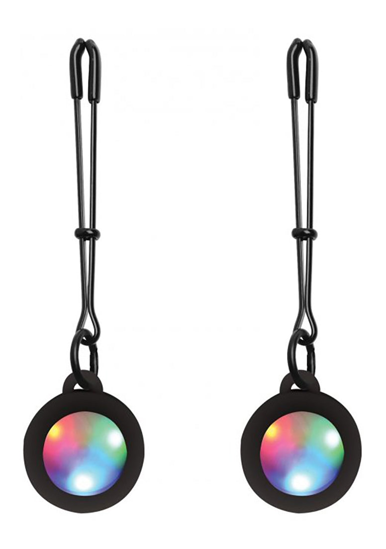 Charm them with your light-up nipple clamps! These black, tweezer nipple clamps are perfect for beginners and advanced users. Combine them with the light-up LED discs for an awesome light-show for your lover!