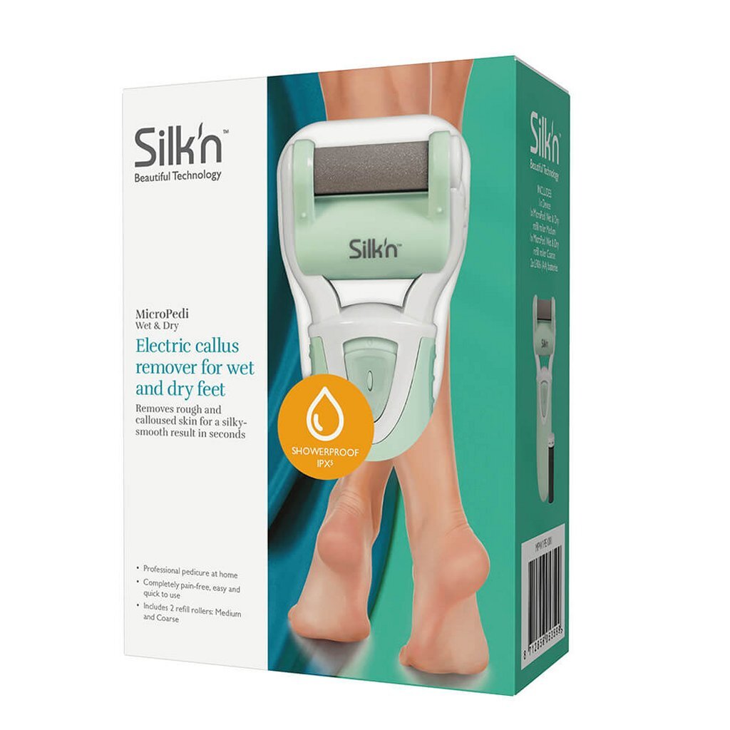 De Silk?n MicroPedi Wet & Dry eeltverwijderaar is met zijn showerproof design speciaal ontwikkeld voor gebruik op droge en natte voeten. Het apparaat bevat ook waterbestendige micro-mineraalrollers die anders zijn dan de andere rollers van Silk?n. Hiermee is het mogelijk om MicroPedi Wet & Dry ook tijdens of na het douchen te gebruiken.