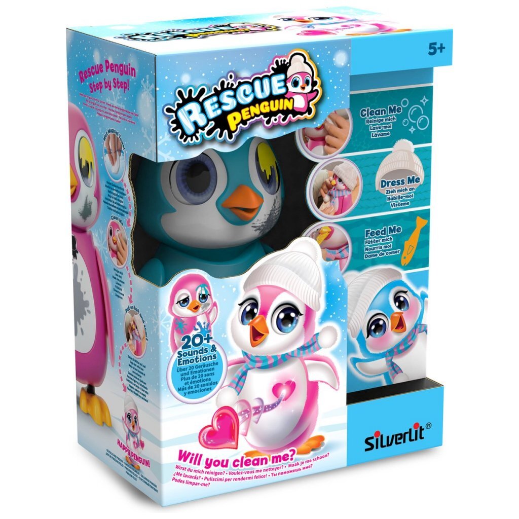Deze schattige, blauwe interactieve Pinguïn heeft gezwommen in een vieze zee en moet gered worden! Gebruik de magische handdoek om de pinguïn schoon te maken en al zijn interactieve functies voor licht en geluid te ontgrendelen. Het hart van je pinguïn verandert van kleur afhankelijk van zijn emoties: klop op zijn buik of schouder en zie hoe zijn hart sneller gaat kloppen. Nu is hij vrolijk en zal hij zingen en dansen! Wanneer je pinguïn het koud heeft en zich blauw voelt, zal hij gaan bibberen. Kleed hem dan aan met een wollen muts, een sjaal en een vest. Nu is hij weer lekker warm! Als hij honger heeft moet je hem voeren met het viskoekje. Maar pas op, voer hem niet te veel, anders laat hij een scheetje! Zorg goed voor je pinguïn en hij zal voor altijd je beste vriend zijn! Met meer dan 20 geluiden en reacties voor interactief spelen. Batterij informatie: 3 x AAA batterijen (meegeleverd). Leefrijdsindicatie: 5 jaar+.
