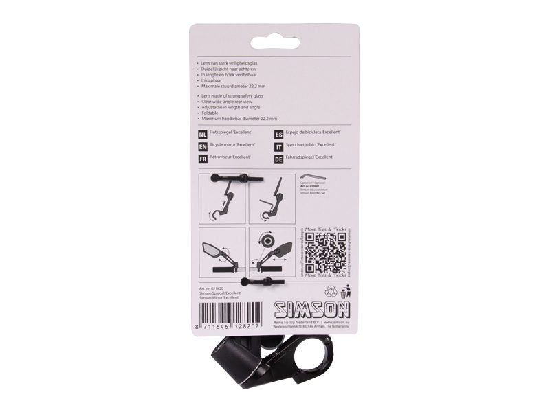 De Simson Spiegel Excellent is een zeer sterke spiegel voor de veeleisende e-bike gebruiker, maar misstaat door de moderne uitstraling op geen enkele fiets. De lens van de Simson Spiegel 'Excellent' is gemaakt van zeer sterk veiligheidsglas. De arm is gemaakt van vezel versterkt nylon en de stuurklem is gemaakt van aluminium. Hierdoor is de Simson Spiegel 'Excellent' zeer ligt van gewicht en tegelijk erg sterk en duurzaam. De spiegel is in lengte en hoek verstelbaar en kan worden ingeklapt als de fiets in een fietsenstalling wordt geplaatst. De Simson Spiegel 'Excellent' is geschikt voor stuurdiameters tot 22,2 cm. Lens van sterk veiligheidsglas Duidelijk zicht naar achteren In lengte en hoek verstelbaar