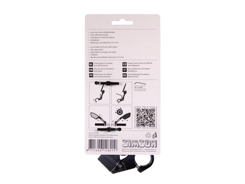 De Simson Spiegel 'Excellent' anti reflecterend is een zeer sterke spiegel voor de veeleisende e-bike gebruiker, maar misstaat door de moderne uitstraling op geen enkele fiets. De lens van de Simson Spiegel 'Excellent' anti reflecterend is gemaakt van zeer sterk veiligheidsglas en heeft een speciale anti reflecterende blauwe coating waardoor er ook bij een vel schijnende zon altijd goed zicht is in de spiegel. De arm is gemaakt van vezel versterkt nylon en de stuurklem is gemaakt van aluminium. Hierdoor is de Simson Spiegel 'Excellent' anti reflecterend zeer ligt van gewicht en tegelijk erg sterk en duurzaam. De spiegel is in lengte en hoek verstelbaar en kan worden ingeklapt als de fiets bijvoorbeeld in een fietsenstalling wordt geplaatst. De Simson Spiegel 'Excellent' anti reflecterend is geschikt voor stuurdiameters tot 22,2 cm. Lens van anti reflecterend veiligheidsglas Duidelijk zicht naar achteren In lengte en hoek verstelbaar