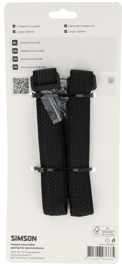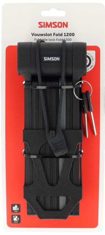 Het Simson vouwslot Fold 1200, heeft een Simson Security Level van 10 (van 15)is geschikt is om (elektrische) fietsen mee op slot te zetten. Door de flexibele scharnierpunten en de 120cm lengte kan de fiets makkelijk aan een hek of paal vastgemaakt worden. Het slot is gemaakt van gehard staal en is bestendigd tegen aanvallen zoals knippen en trekken. De rubberen behuizing van de schakels zorgt ervoor dat er geen krassen op de fiets komen. Het slot is voorzien van een stofkap die de cilinder beschermd tegen vocht en vuil, dit helpt bij de duurzaamheid van het slot. De houder past op de bidon nokken en kan ook gemonteerd worden met de meegeleverde flexibele strips.