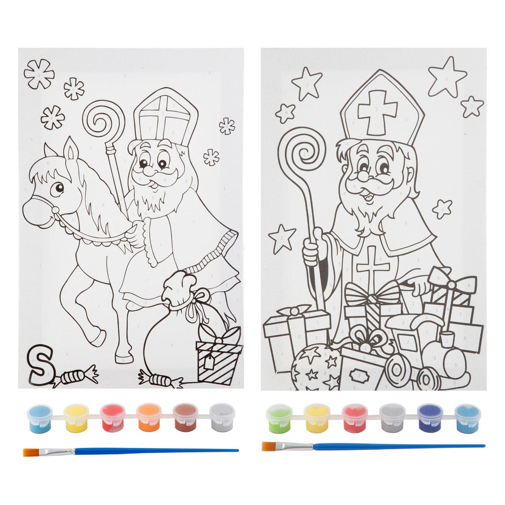 Canvasdoeken met Sinterklaastekeningen voor schilderen op nummer. Inclusief 6 potjes verf en een kwastje. Geschikt vanaf 5 jaar.