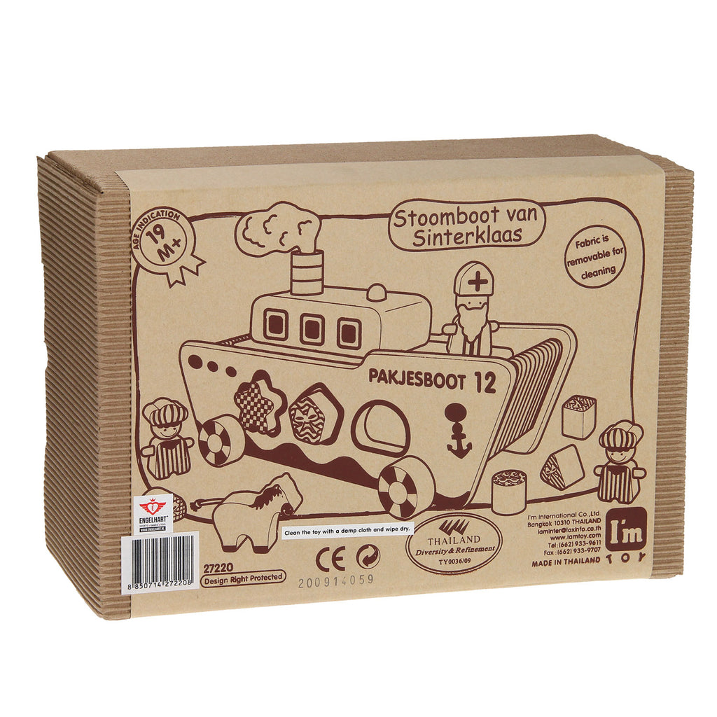 De houten originele pakjesboot 12 met sinterklaas, Ozosnel en 2 pieten. De boot is gemaakt als vormenstoof. Afmetingen: 28 x 16 cm. Geschikt vanaf 12 maanden.