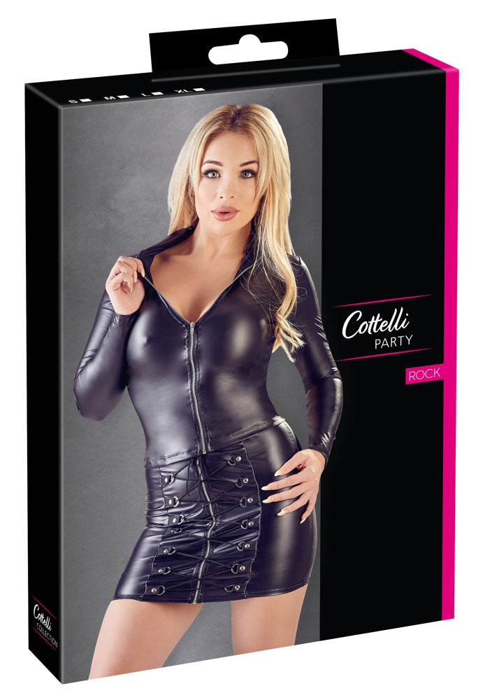 Black matte look skirt with a full-length zip underneath the elaborate lacing that can be worn at the front or back.
