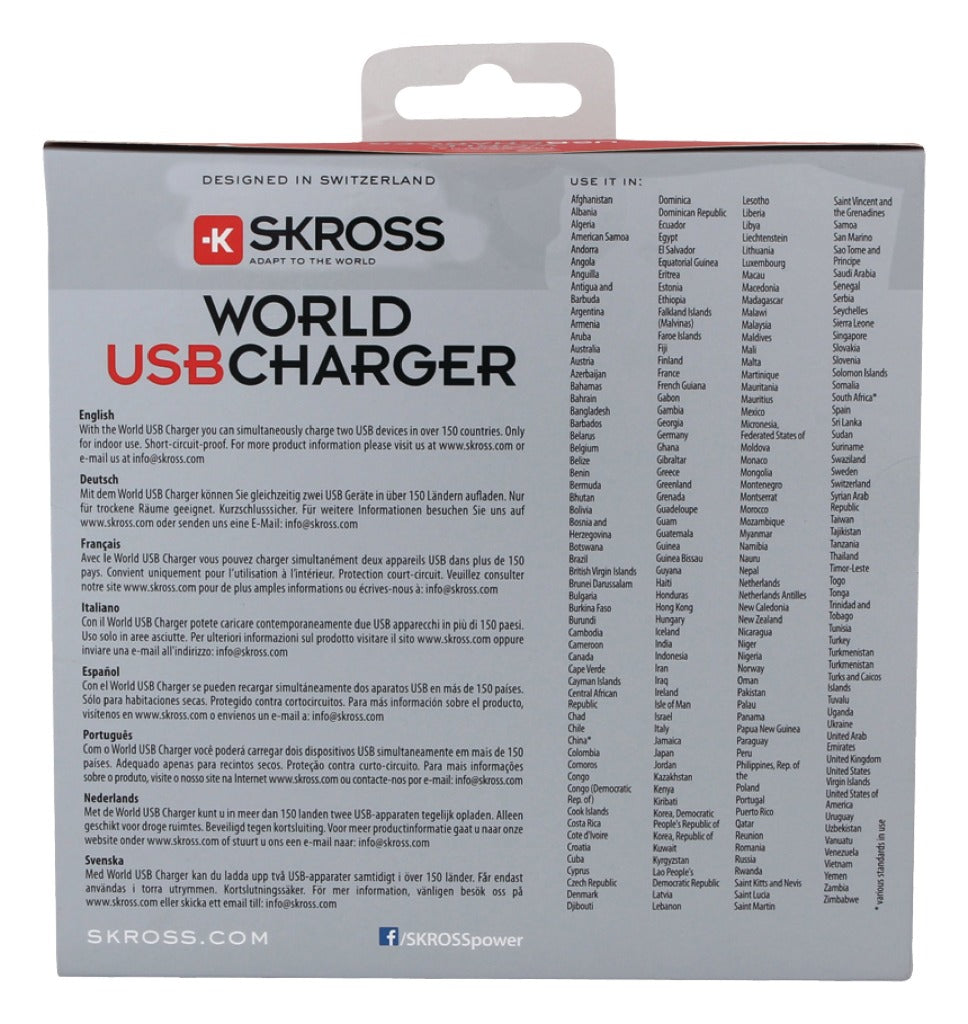 Smartphone, MP3-speler, tablet-pc, gameconsole: de huidige trend neigt naar USB-apparaten. De wereld-USB-oplader van SKROSS voorziet ze wereldwijd allemaal van stroom, volledig betrouwbaar, verbluffend snel en bijzonder gemakkelijk.