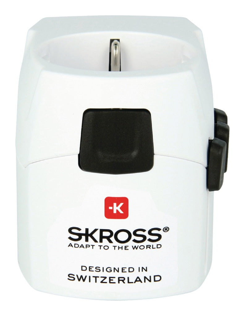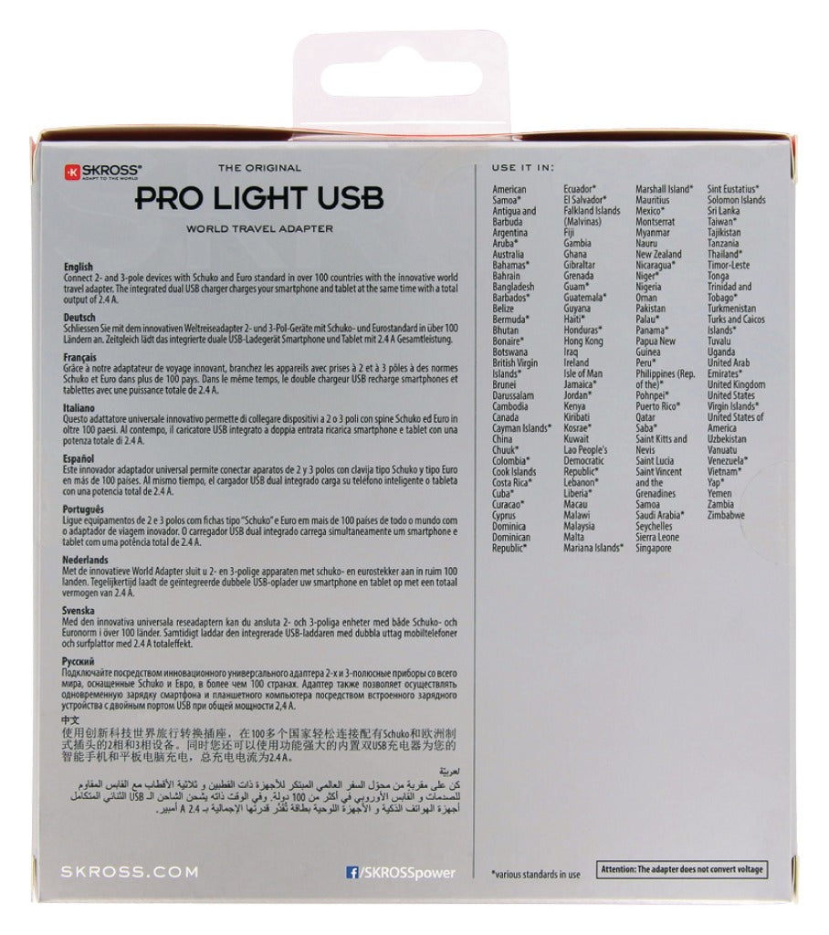This is made possible by a dual USB charger, which has been directly integrated into a SKROSS® 3-pole travel adapter for the first time. Therefore, the connection side of the adapter is left free during the charging process and can be used without restriction. The USB ports provide sufficient energy to charge two USB devices simultaneously, even if another device is connected via the adapter at the same time.