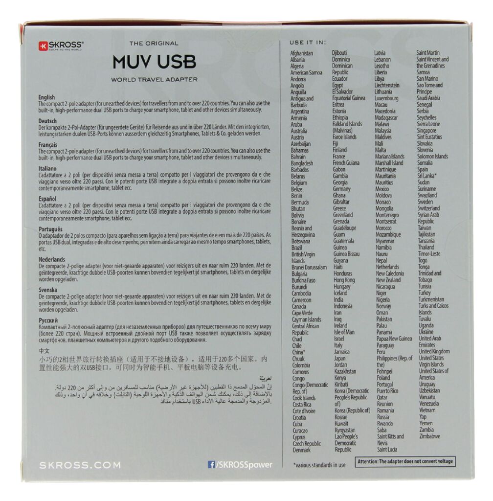 The compact, versatile World Adapter MUV USB from SKROSS® can do everything you want it to, all at once. While the adapter provides the correct connection for your electric razor, the dual USB charger module can top up the battery on both your smartphone and your tablet.