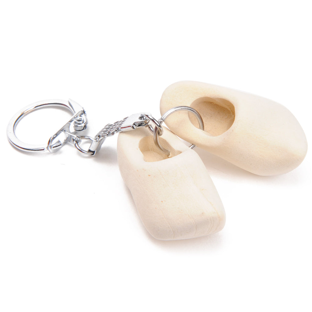 Leuke sleutelhanger met twee houten klompjes eraan. Geef de klompjes kleur met stiften of verf en ontwerp je eigen design!