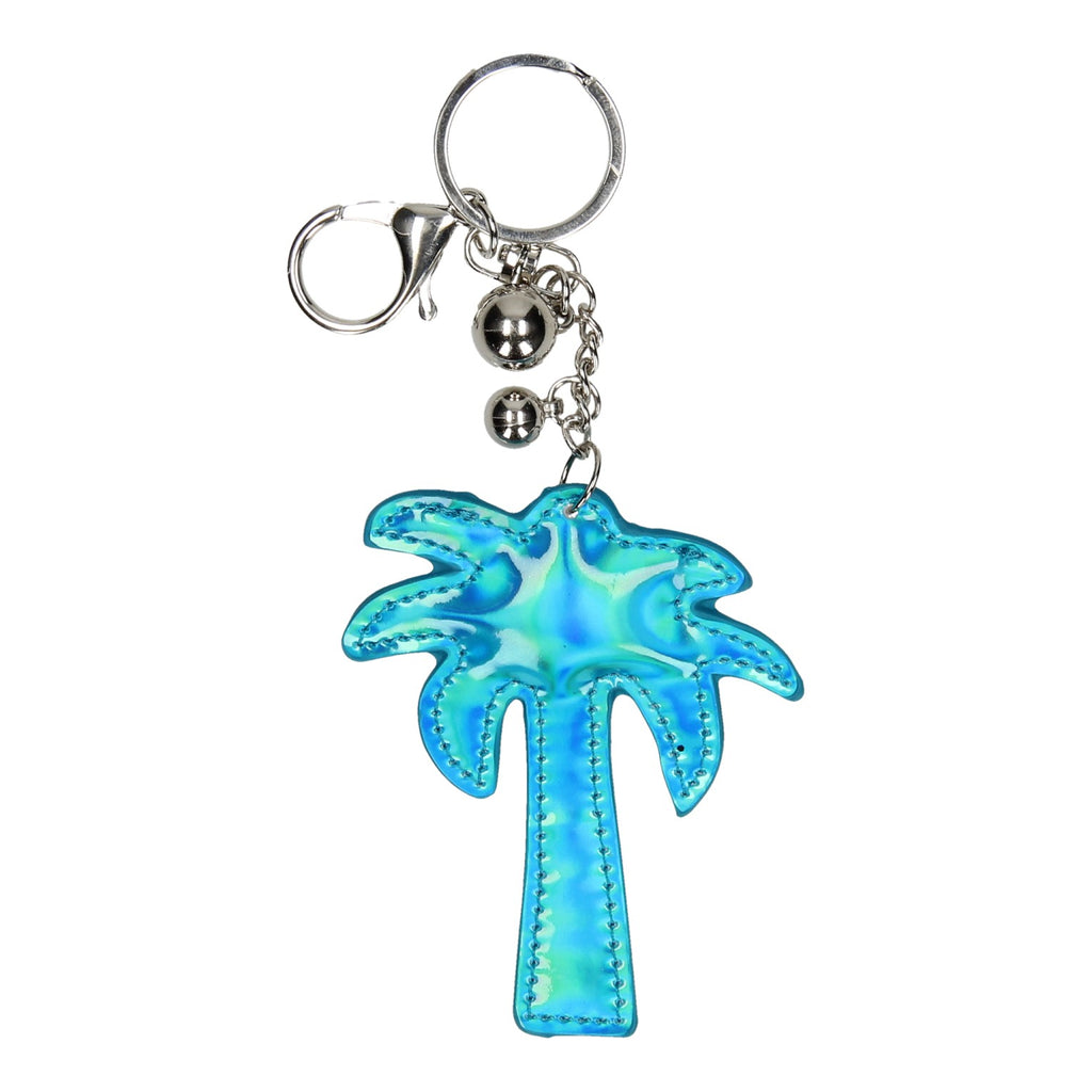 Blauwe sleutelhanger in de vorm van een palmboom, gemaakt van imitatieleer. De sleutelhanger is voorzien van een sleutelring en metalen haak.
