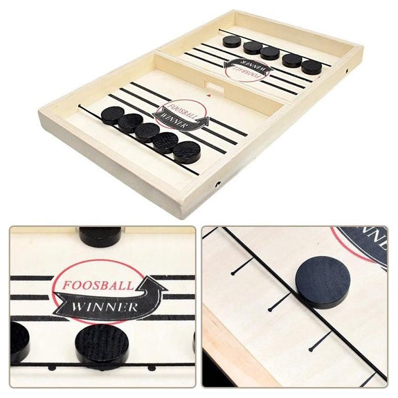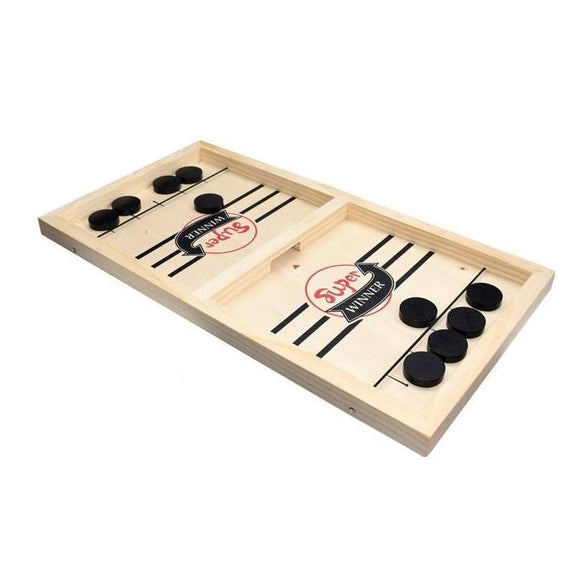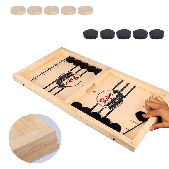 Twee spelers proberen hun zijde van het speelveld vrij te maken van de pucks. Door middel van de elastiek schiet je de pucks naar de andere kant. De speler die als eerste zijn kant van het speelveld leeg heeft wint. Dit is een snel en fanatiek spel maar ook heel erg gezellig. Probeer het uit!