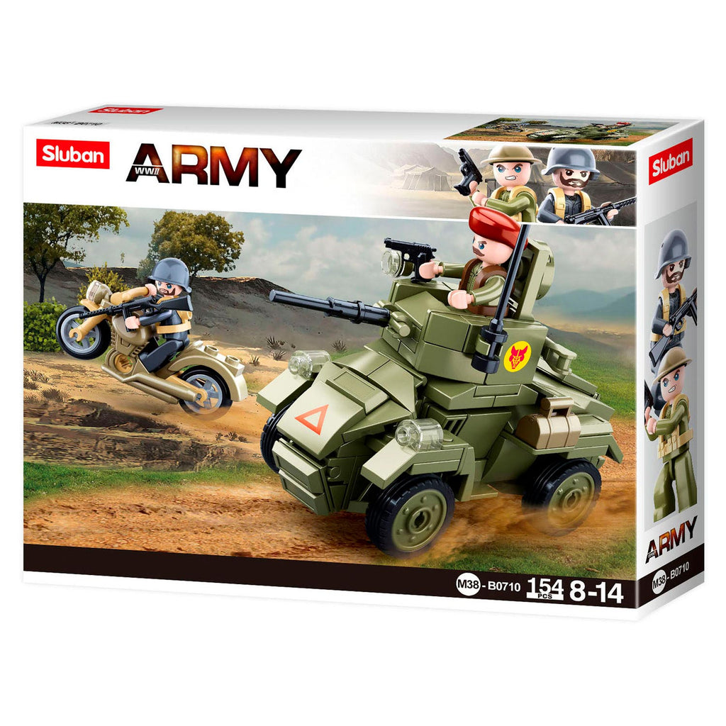 Versla de vijand met deze 2 stoere soldaten en hun voertuigen! De ene soldaat is iedereen te snel af op zijn motor, de ander zit veilig in een gepantserd voertuig. Inhoud: twee soldaten met wapens, een motor en een gepantserd voertuig. Gemaakt van kunststof.