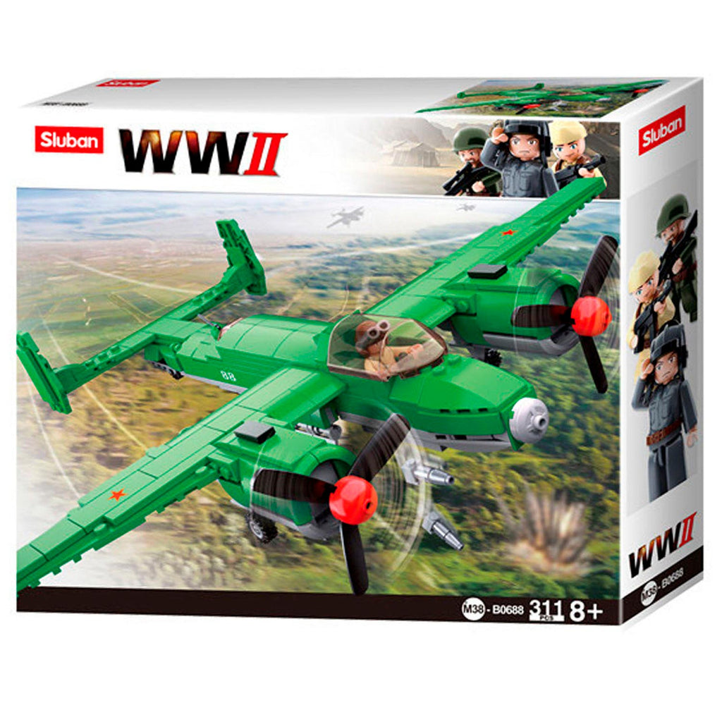 Deze Sluban WWII bommenwerper M38-B0688 is de enige redding wanneer het over land en over zee niet gaat. Met zijn twee propellers heeft de bommenwerper maximale snelheid om vol in de aanval te gaan. Inclusief 1 poppetje. Aantal blokjes 312.