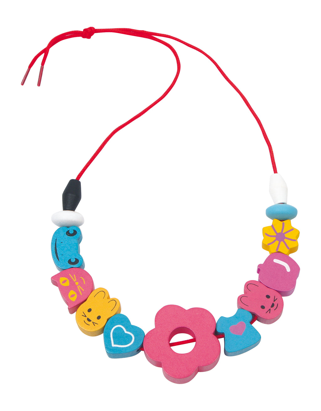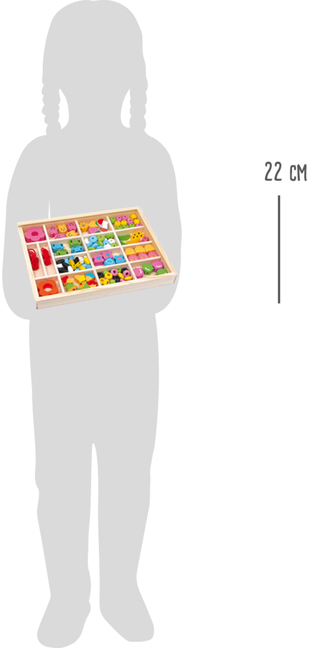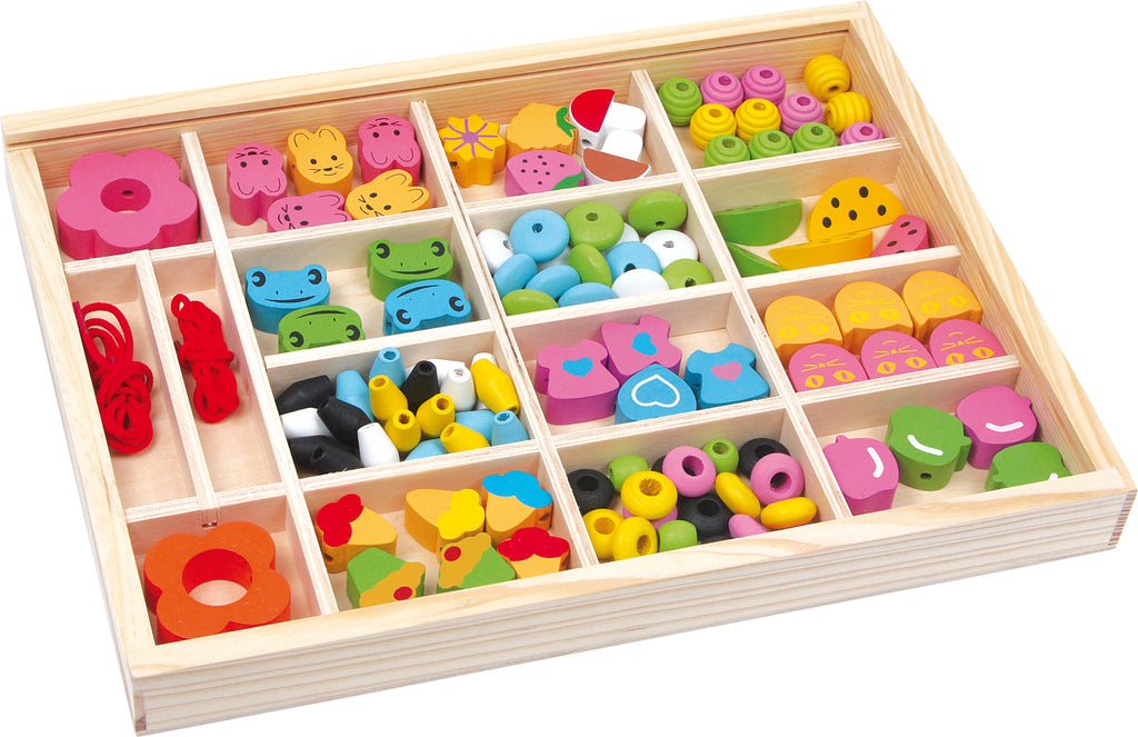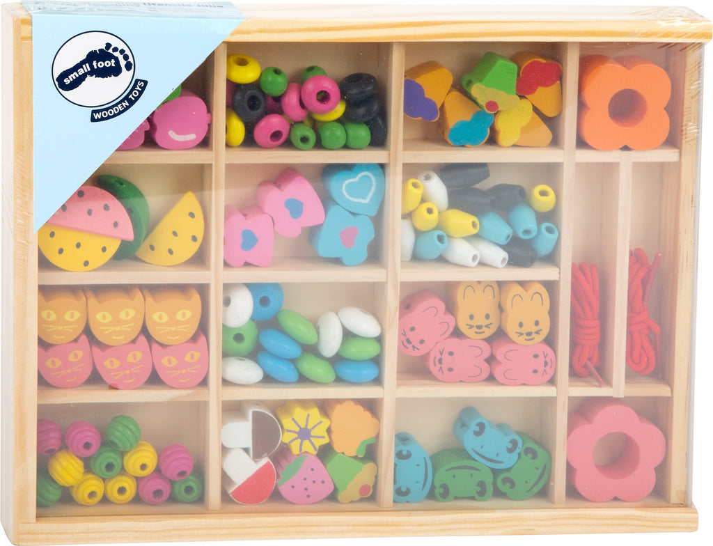 Deze verzameldoos van hout bevat liefdevol en felgekleurd ontworpen houten elementen, waarmee kinderen hun eigen kettingen, armbanden of hangers kunnen maken! Een plastic deksel geeft zicht op de inhoud en houdt de elementen in hun 16 vakjes. Incl. 2 linten.
