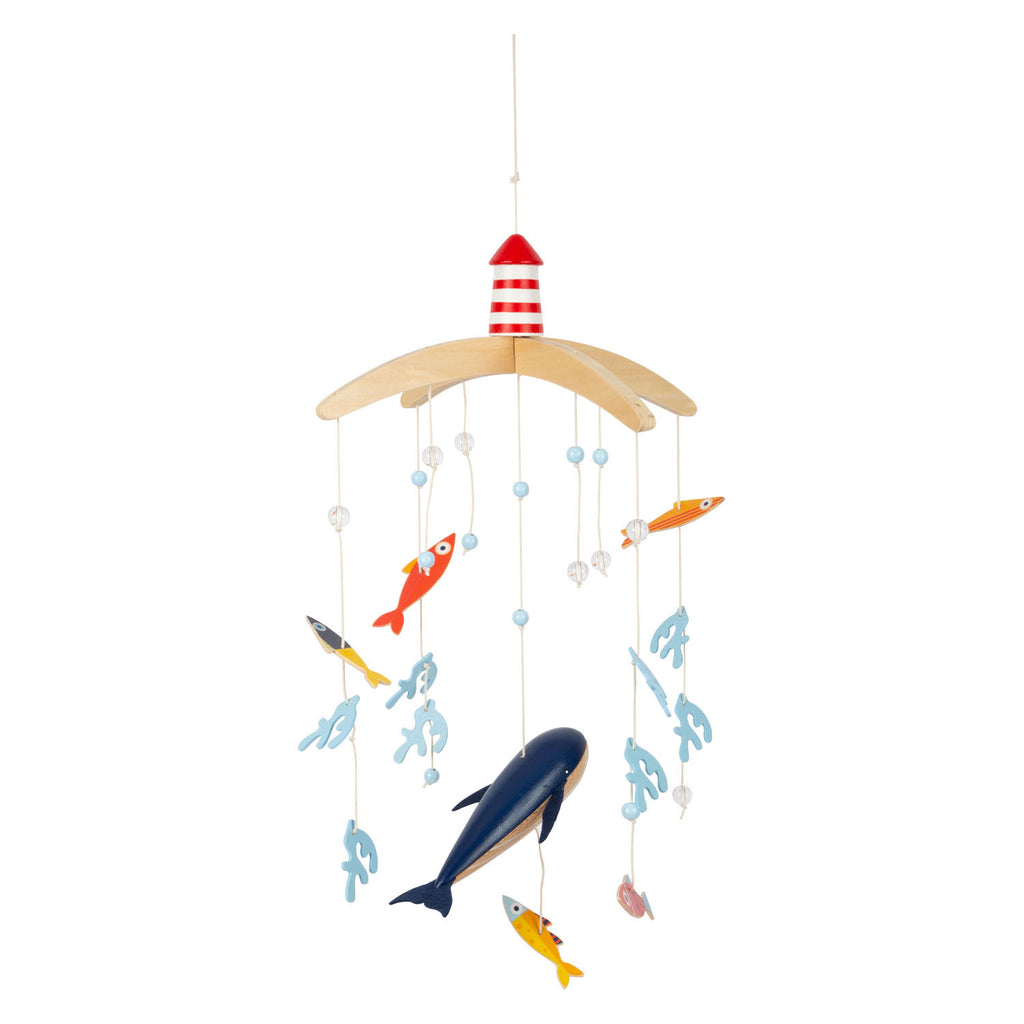 Vanuit het perspectief van kinderen zijn de driedimensionale mobiele elementen en sterk contrasterende kleuren goed zichtbaar. Als deze kinderkameraccessoire ronddraait, is het voor de jonge waarnemers bijzonder interessant om te zien hoe de vissen op een rustige manier in een cirkel zwemmen. Met de grote vuurtoren is deze mobiel een geweldige decoratieve blikvanger in de kinderkamer - en niet alleen voor de jonge, beginnende diepzeeduikers!