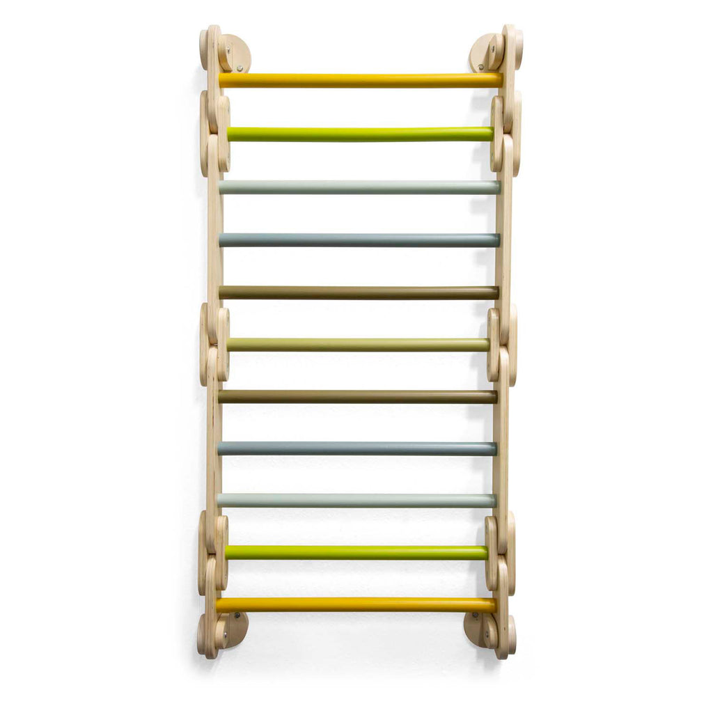2-in-1 klim driehoek en klimrek. Geschikt voor kinderen vanaf 24 maanden. Het formaat is 150 x 64 x 10 cm.