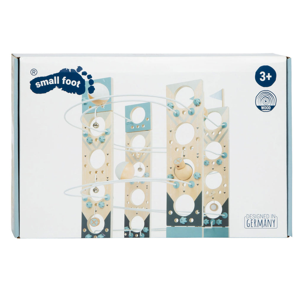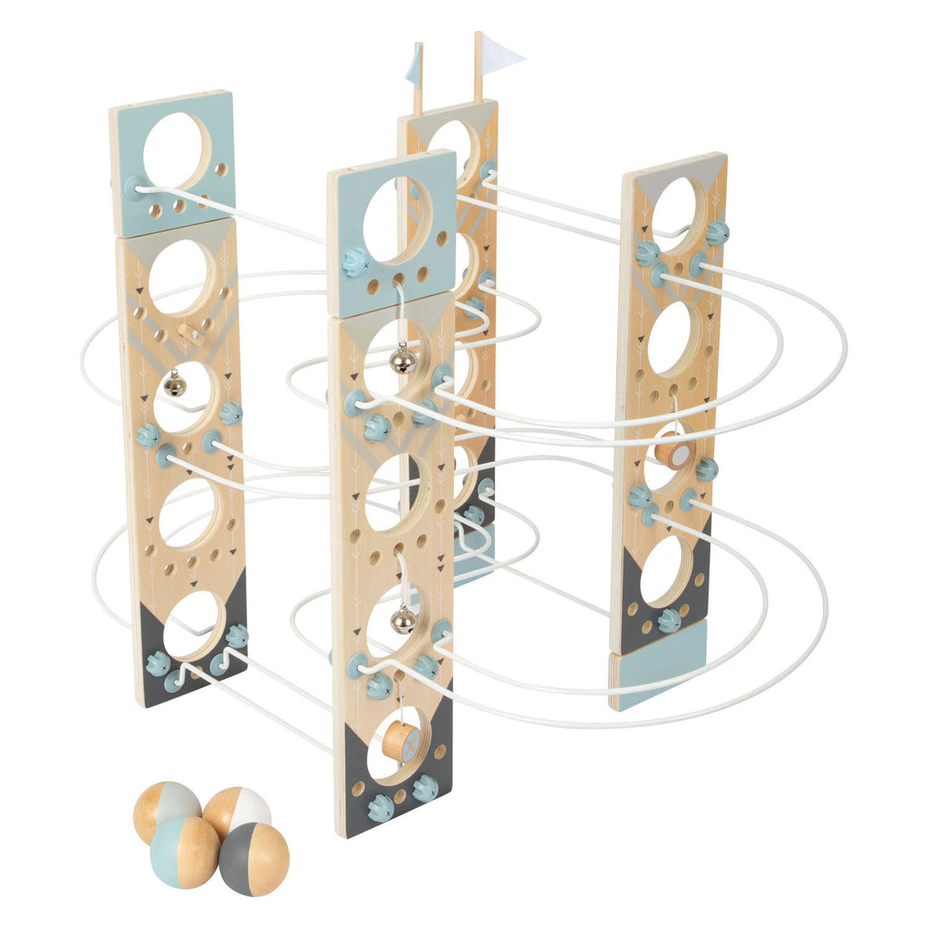 Bouwspeelgoed en knikkerbaan in één! Deze modulaire knikkerbaan in minimalistisch Scandinavisch design trekt jonge, ambitieuze bouwers aan als magie! Dankzij het flexibele systeem van verschillende metalen palen en speciale verbindingselementen biedt deze knikkerbaan volop montage- en constructiemogelijkheden. Met de vier grote ballen van massief hout, stoppers, belletjes en een finishvlag is langdurig speelplezier gegarandeerd! Wordt geleverd met instructies met montagesuggesties. Het modulaire montageprincipe maakt nieuwe, unieke tracks mogelijk en inspireert tot experimenteel en fantasierijk spel. De stoppers en belletjes helpen de ballen te vertragen tijdens hun snelle run door de bochten en de steile hellingen, terwijl de witte en blauwe vlaggen het begin en einde van de run aangeven. Door de verschillende onderdelen in elkaar te zetten, wordt op een speelse manier de fijne motoriek getraind, terwijl de bellen akoestische hoogtepunten bieden. Met zijn subtiele dessin met trendy rookblauw en veel natuurlijk, onbehandeld hout, past deze knikkerbaan prachtig in elke woonkamer of kinderkamer! En dat is bijzonder praktisch: na de speeltijd kan de knikkerbaan weer worden gedemonteerd en ruimtebesparend worden opgeborgen.