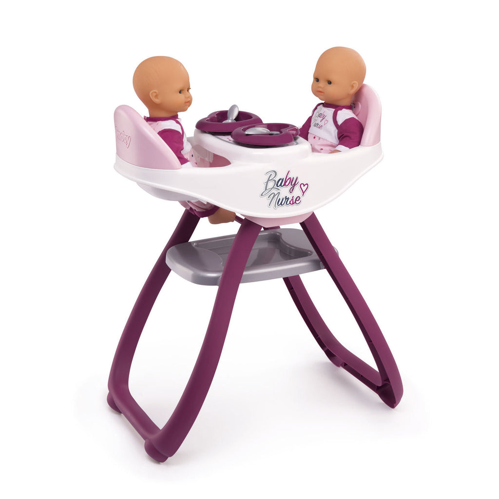 Geef niet 1, maar 2 poppen te eten in deze Smoby Baby Nurse Babystoel voor 2 poppen. De stoel is geschikt voor poppen met een lengte tot 42 cm. De babystoel is gemaakt van stevig kunststof, het zitgedeelte heeft een lichtroze kleur, de poten (standaard) van de stoel hebben een rozepaarse kleur. Het tafelblad kan van de standaard afgenomen worden en zo als schommelstoel dienen. Inclusief 2 lepel en 2 borden zodat jij jouw poppen lekker eten kunt geven. Exclusief poppen.
