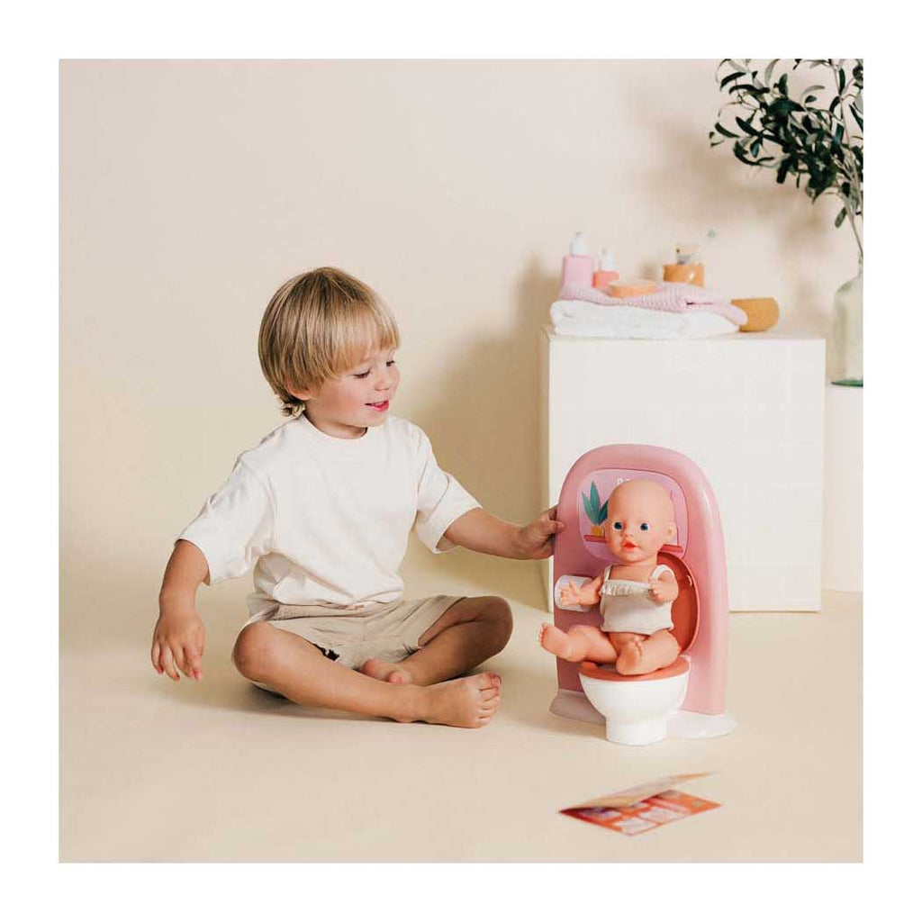 Aan de andere kant bevindt zich de wastafel met een kleine spiegel, tandenborstelbeker en tandenborstel. Met dit compacte poppenmeubel is poppenverzorging een feest en leren en oefenen kinderen ondertussen de basisprincipes van de dagelijkse persoonlijke hygiëne. Geschikt voor poppen tot 42 cm. Pop niet inbegrepen.