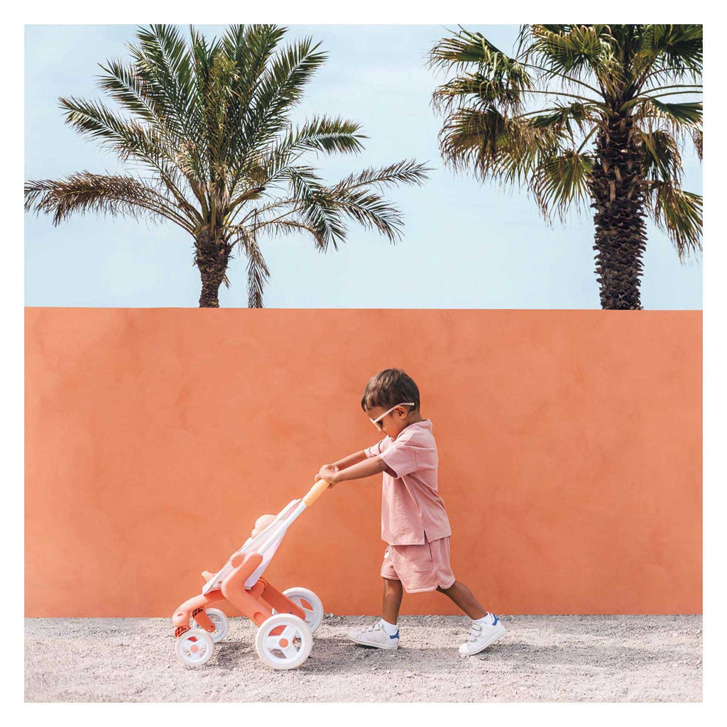 Lichte poppenbuggy met stoffen zitje, metalen frame en zwenkwielen. Ergonomisch ontwerp, geschikt vanaf 18 maanden. Voor poppen tot 42 cm, gemaakt in Spanje.