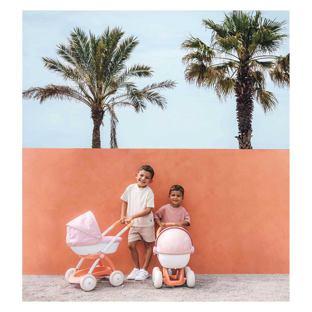Lichtgewicht poppenwagen met afneembare reiswieg, inklapbare kap en opbergvak. Gemaakt van metaal en kunststof, handvathoogte 58 cm. Geschikt vanaf 18 maanden.