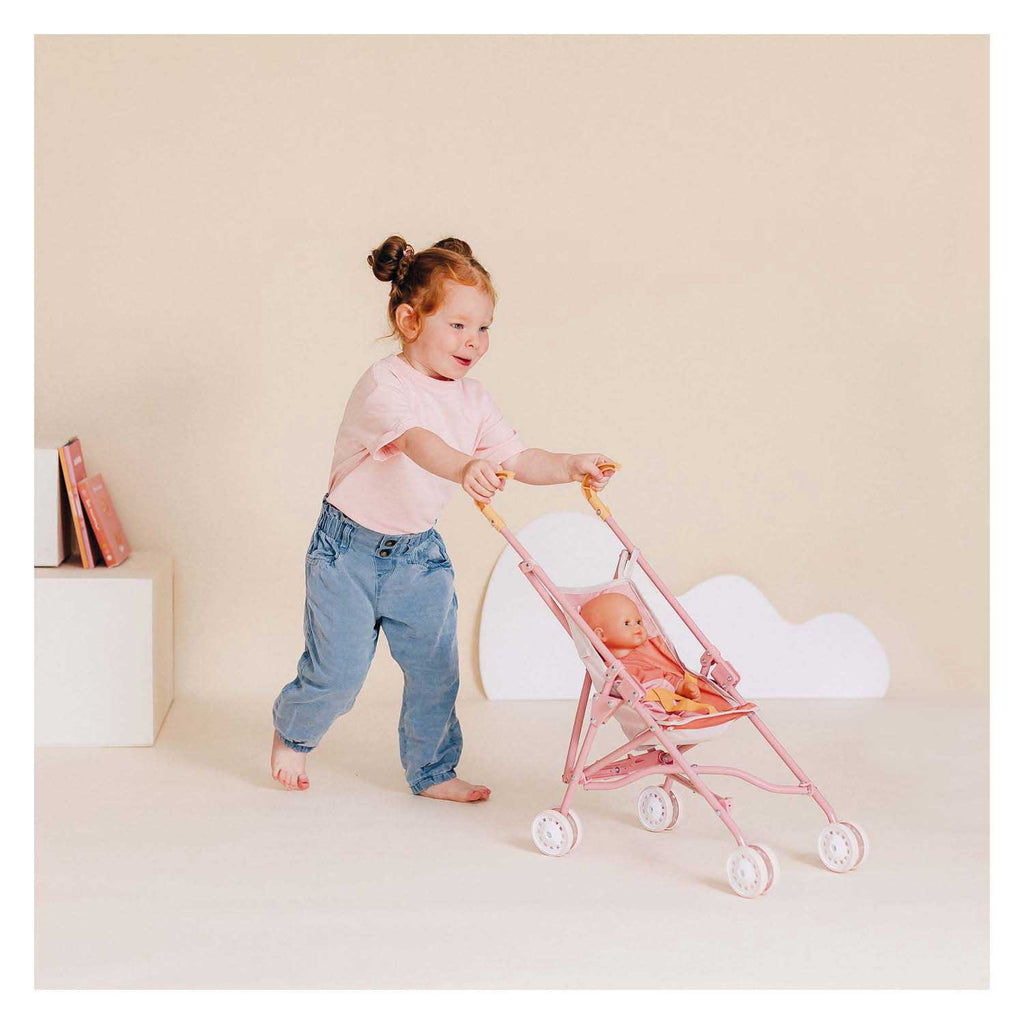 Inklapbare poppenbuggy in Baby Nurse kleuren, geschikt voor poppen tot 42 cm. Gemaakt van metaal en kunststof, met afneembare en wasbare stof. Afmetingen: 57 x 51,5 x 25 cm.