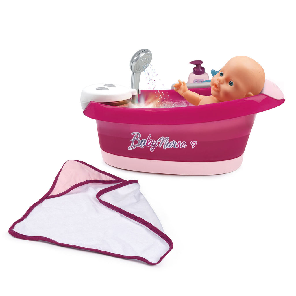 Roze poppenbadje met 2 verschillende standen: water uit de douchekop of gekleurde lampjes en bellen in het badje. Accessoires: badcape, zeeppompje en thermometer. Geschikt voor poppen tot 42 centimeter lang. Pop niet inbegrepen. Geschikt voor kinderen vanaf 3 jaar oud.