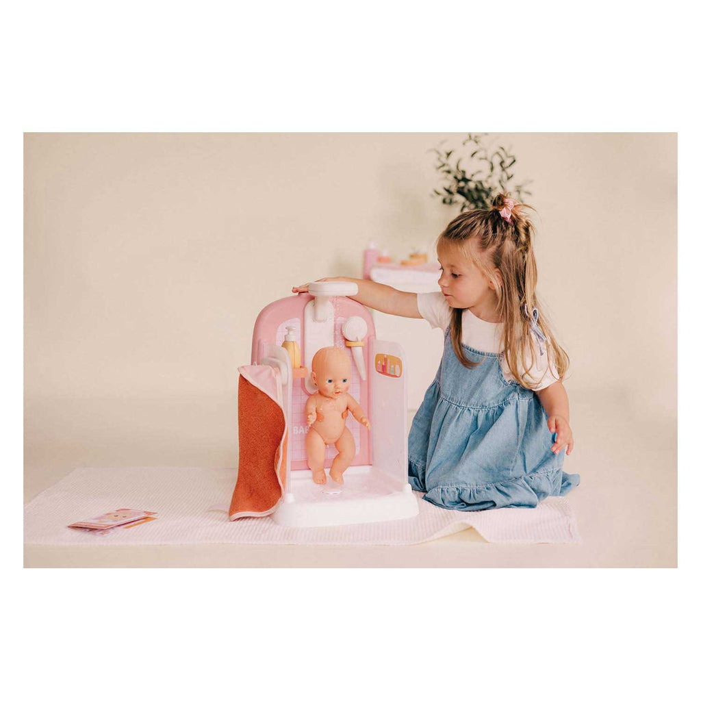 De set bevat een badcape van zachte badstof, zodat de pop het na het douchen niet koud krijgt. Deze wordt opgehangen aan de haken aan de zijwand van de douche. De andere kledinghaken zijn geschikt voor poppenkleertjes, terwijl het plankje voldoende ruimte biedt voor de belangrijkste verzorgingsproducten. De set bevat ook een badspons waarmee de pop liefdevol gewassen kan worden, een handdouche zonder functie, een lege fles douchegel en een kindvriendelijk informatieboekje over douchen.