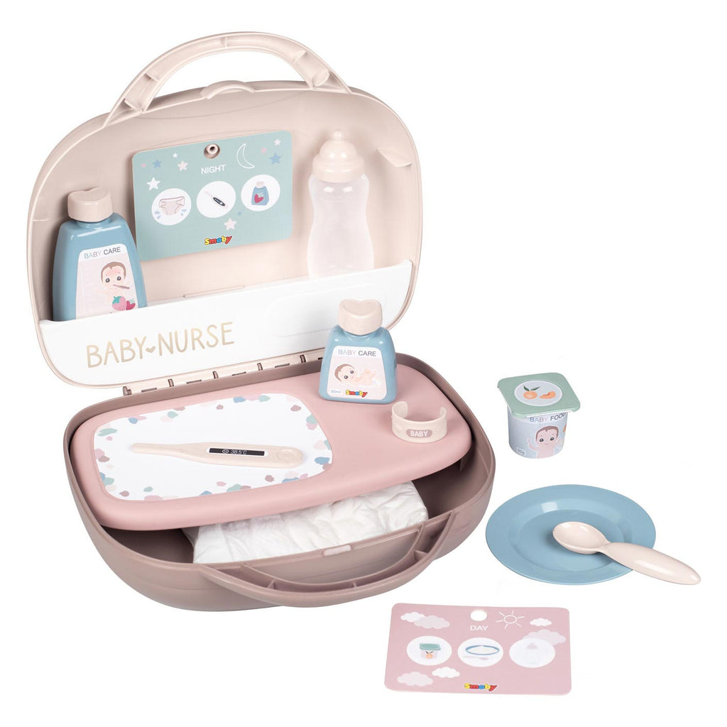 Smoby verzorgingsset voor poppen, 13-delig. Bestaande uit: kaarten, lepel, bordje, babyflesje, luier, thermometer, 2 flesjes, yoghurtkuipje, armband en een afneembaar plateau in de koffer, wat ook te gebruiken is als verschoontafel. Het koffertje is 24 bij 10,7 bij 24 centimeter groot. Geschikt voor kinderen vanaf 3 jaar oud.
