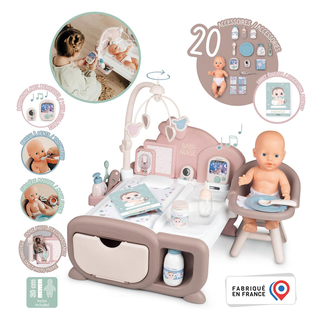 Stevige, kunststof poppenkamer met multifunctioneel ontwerp: slaapkamer, aankleedtafel en eetkamer in één. De poppenkamer uit de Baby Nurse-lijn van Smoby is taupe- en rozekleurig en wordt geleverd met 20 poppenaccessoires. Geschikt voor kinderen vanaf 3 jaar. Inclusief pop, exclusief batterijen (werkt op 2 AAA batterijen).