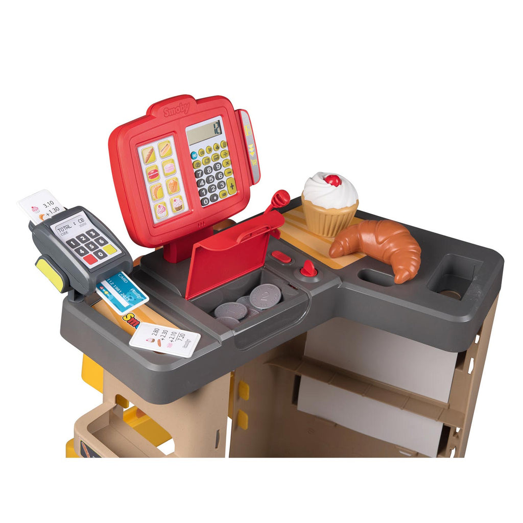 Smoby bakkerij. De bakkerij is 50 bij 20 bij 65,5 centimeter in afmeting. Inhoud: kassa, pinautomaat, credit card, 4 baguettes, 4 bitterkoekjes, 2 muffins, 2 croissants, 2 brioches en 1 chocolade-eclair. Geschikt voor kinderen van 3 tot 6 jaar oud. Voor kinderen vanaf 3 jaar. Gemaakt in Frankrijk. 1 x LR54-batterij inbegrepen.