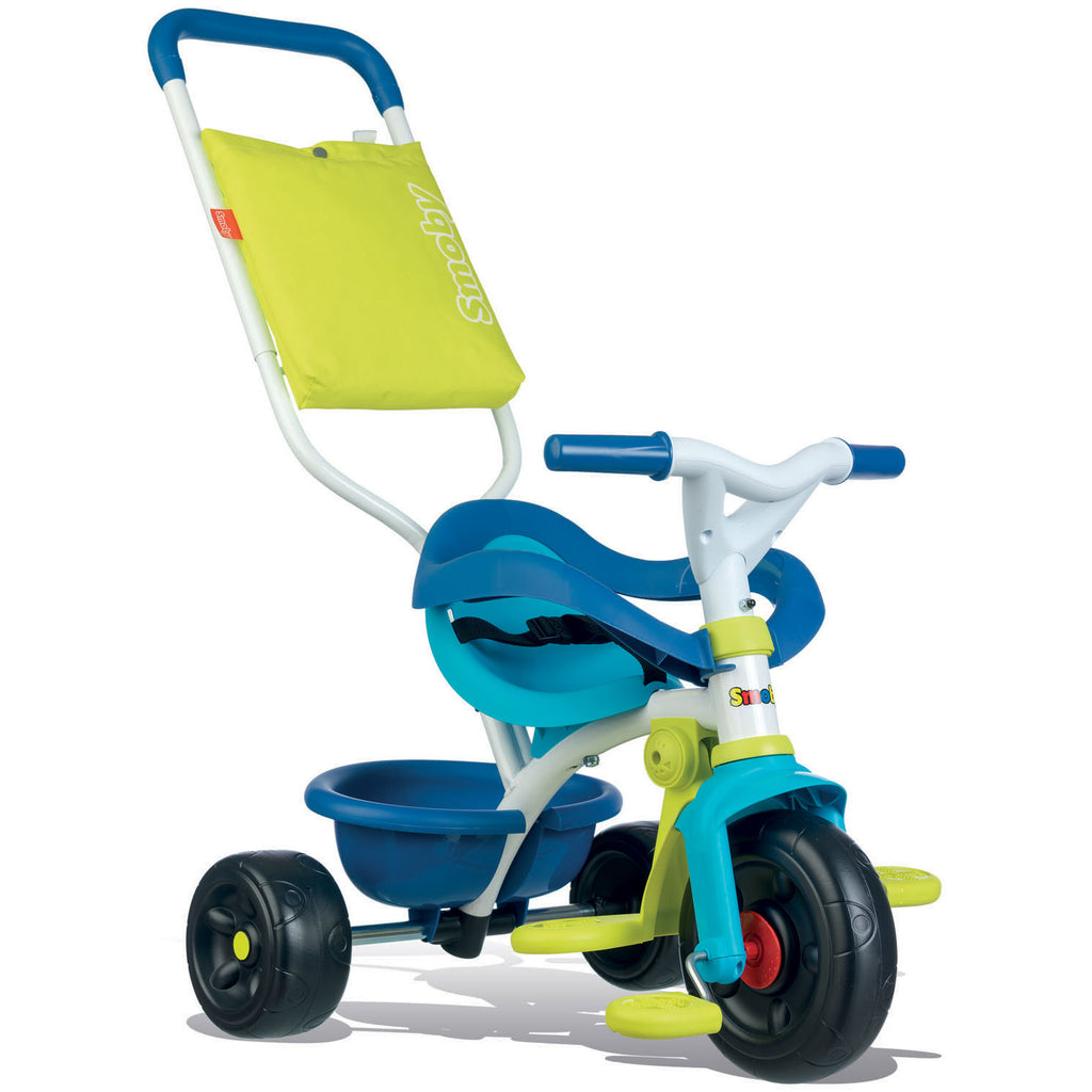 De Smoby be fun comfort driewieler heeft de kleuren licht- en donkerblauw en limegroen en is van alle gemakken voorzien. Zo heeft de driewieler een kantelbare kiepbak om al je speelgoed mee te nemen. Door de verwijderbare en in hoogte verstelbare duwstang kan je je laten voortduwen door een volwassene terwijl jij je beentjes laat rusten op de verwijderbare voetsteunen. De Smoby driewieler heeft een zitje met veiligheidsring, veiligheidsriem en anti-slip pedalen zodat je veilig op pad kunt gaan. De 3 grote zwarte wielen zorgen ervoor dat de driewieler stevig op de grond blijft staan. Verder zorgt het verstelbare zitje voor de juiste zithouding.