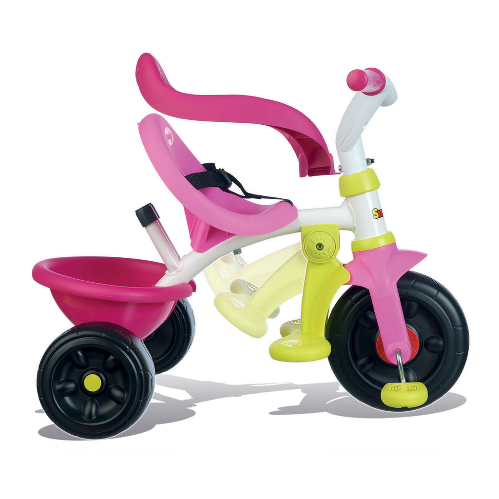 De Smoby be fun comfort driewieler heeft de kleuren licht- en donkerroze en limegroen en is van alle gemakken voorzien. Zo heeft de driewieler een kantelbare kiepbak om al je speelgoed mee te nemen. Door de verwijderbare en in hoogte verstelbare duwstang kan je je laten voortduwen door een volwassene terwijl jij je beentjes laat rusten op de verwijderbare voetsteunen. De Smoby driewieler heeft een zitje met veiligheidsring, veiligheidsriem en anti-slip pedalen zodat je veilig op pad kunt gaan. De 3 grote zwarte wielen zorgen ervoor dat de driewieler stevig op de grond blijft staan. Verder zorgt het verstelbare zitje voor de juiste zithouding.