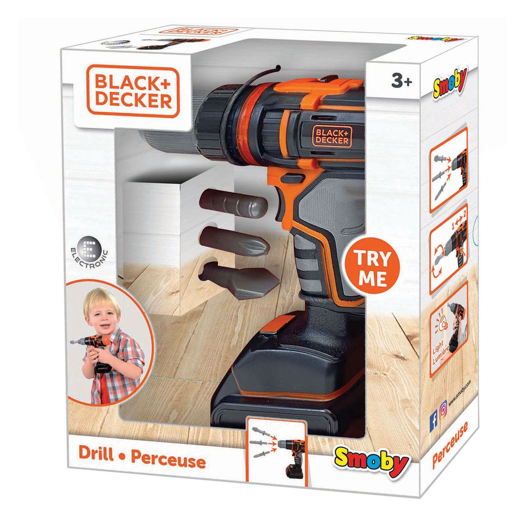 Elektrische boormachine op batterijen van Smoby en BLACK+DECKER. De speelgoedboormachine heeft 3 verwisselbare tips (plat, kruisvormig en bit). Gemaakt van kunststof en geschikt voor kinderen vanaf 3 jaar.