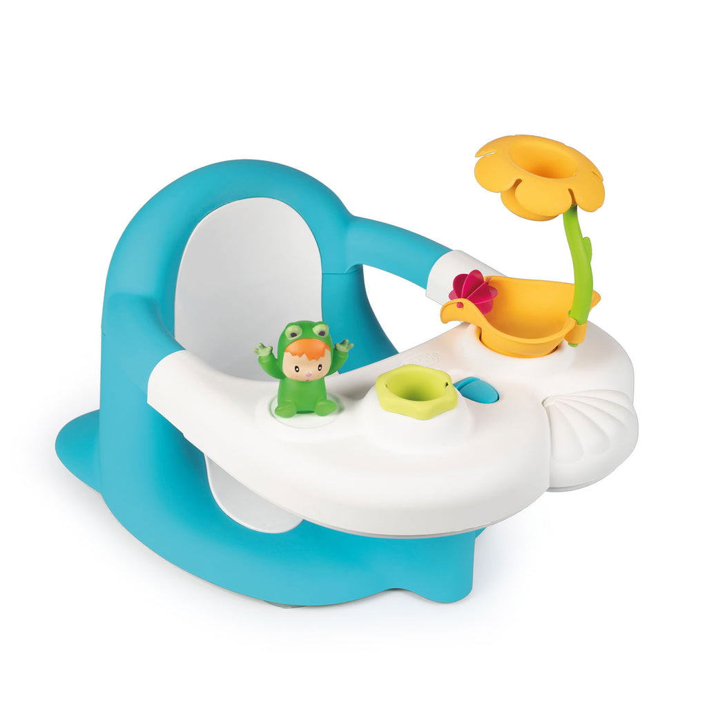 Smoby Cotoons badzitje in blauw en wit. Op het blad staat een bloem, bekertje en een kindje verkleed als kikker om mee te spelen met water. Met zuignap aan de onderkant en knop om het blad uit te schuiven.