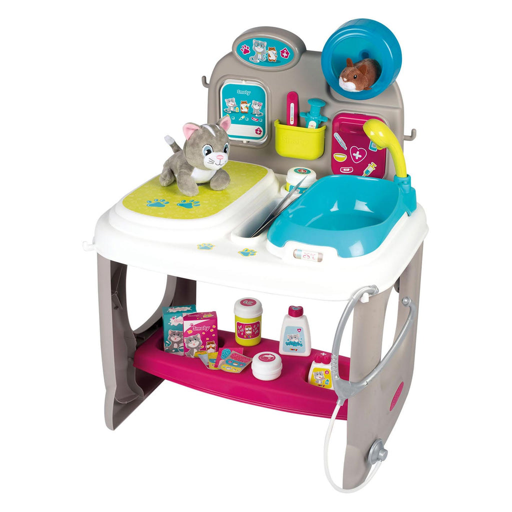 Speelgoed dierenartsenpraktijk van Smoby, met behandeltafel en wasruimte. Er zitten 11 accessoires bij deze speelgoed dierenartspraktijk en ook twee pluchen patiënten om te behandelen: een hamster en een kitten. Afmetingen: 52,3 x 46,1 x 70,7 centimeter. Geschikt voor kinderen vanaf 3 jaar oud.