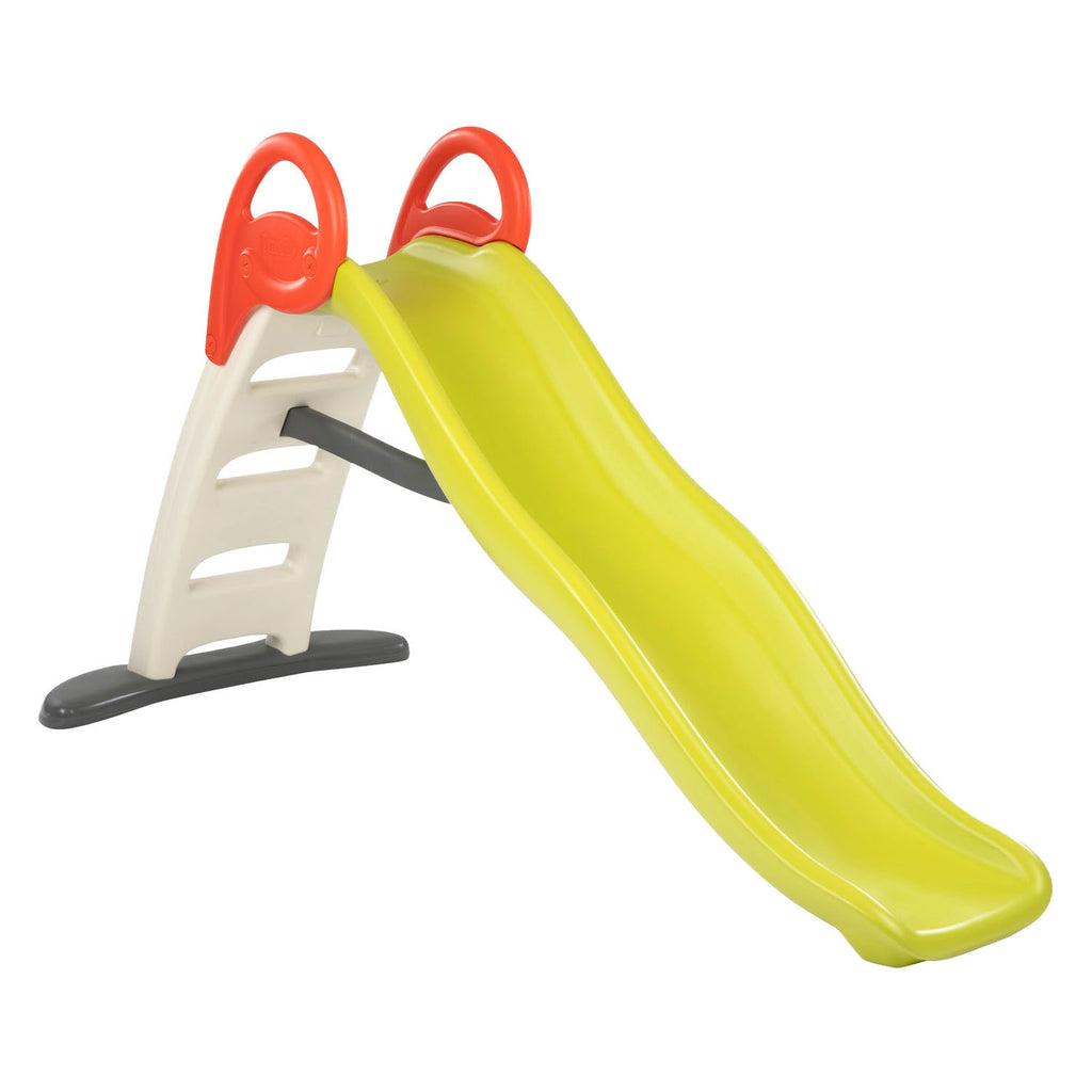 Smoby glijbaan van 2 meter lang met brede voet, trap met leuningen en antisliptreden voor veiligheid. UV-behandeld voor een lange levensduur. Geschikt vanaf 2 jaar.