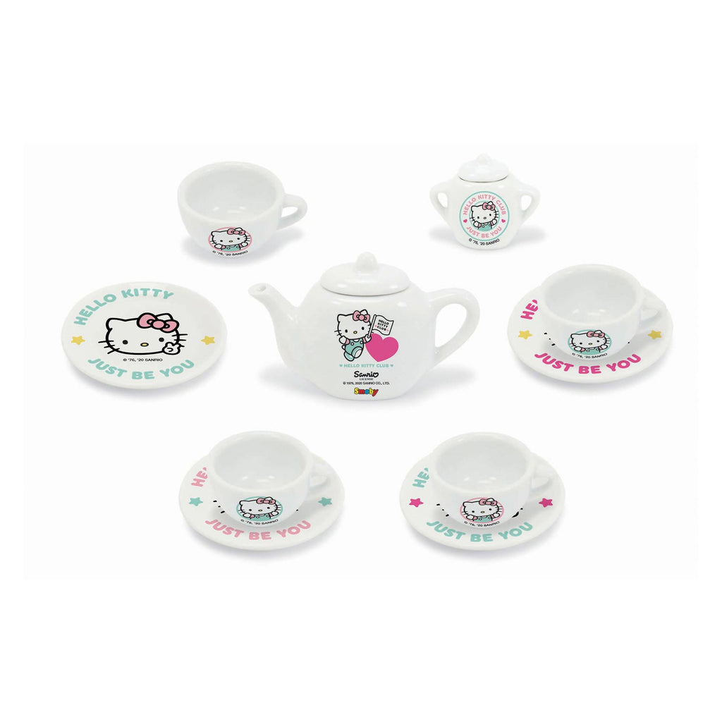 12-delige speelgoedservies van porselein. Gemaakt van wit porselein met Hello Kitty prints. Bestaat uit 1 theepot, 1 suikerpot, 4 kopjes, 4 schoteltjes. Geschikt voor kinderen van 3 jaar en ouder.