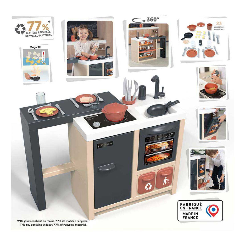 Smoby Keuken Eiland met 360° speelmogelijkheden, 34 accessoires en realistische onderdelen zoals oven, kookplaat, koelkast, kraan/wasbak en espressomachine. Open ontwerp voor samenspel. Geschikt vanaf ca. 3 jaar.