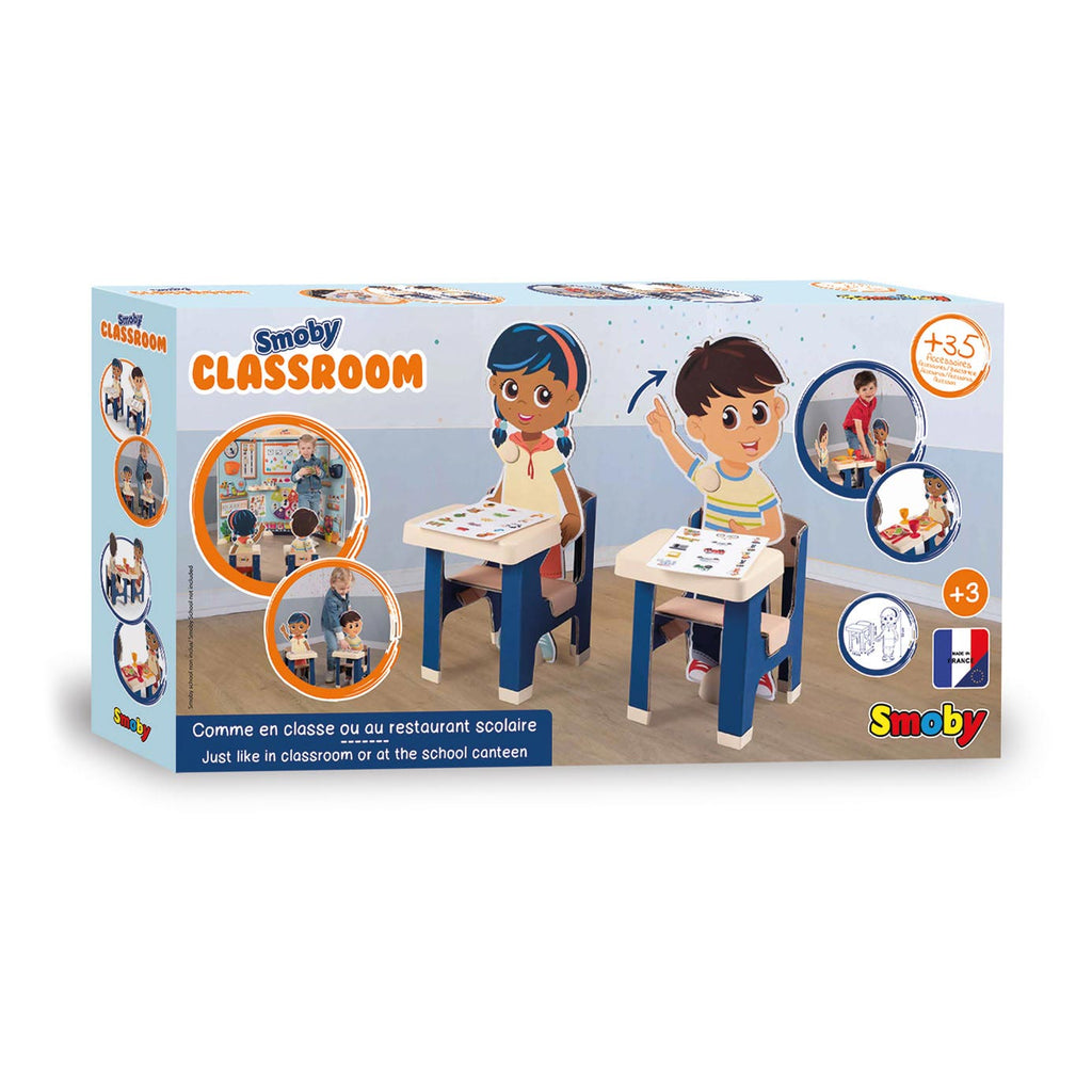 Smoby klaslokaal als aanvulling op het Smoby schooltje. Nu kun je lesgeven aan een echt schoolklasje! De set bestaat uit 2 bureaus en 2 leerlingsilhouetten (hoogte: 53 cm). Voor kinderen vanaf 3 jaar oud.