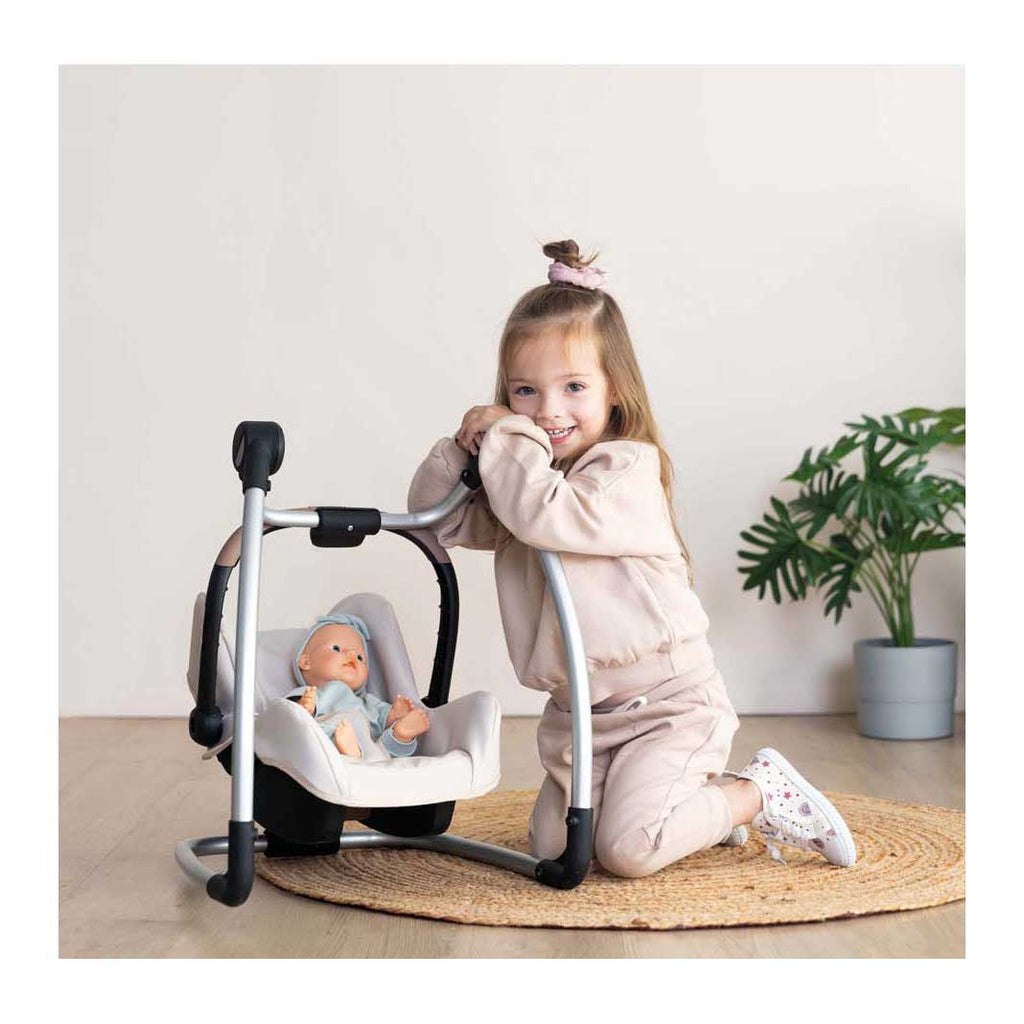 3-in-1 poppenstoel als kinderstoel, schommel en autostoel. Met gordel, verstelbaar handvat en opbergvak. Licht en stevig, afmetingen 45 × 41 × 71 cm. Geschikt vanaf 3 jaar. Gemaakt in Spanje.